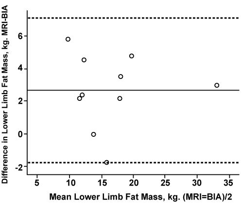 Conclusions: When compared to results obtained during MRI, BIA significantly underestimated fat mass. Overall, accuracy was poor and it can be concluded that BIA showed poor agreement with MRI in the quantification of fat mass.