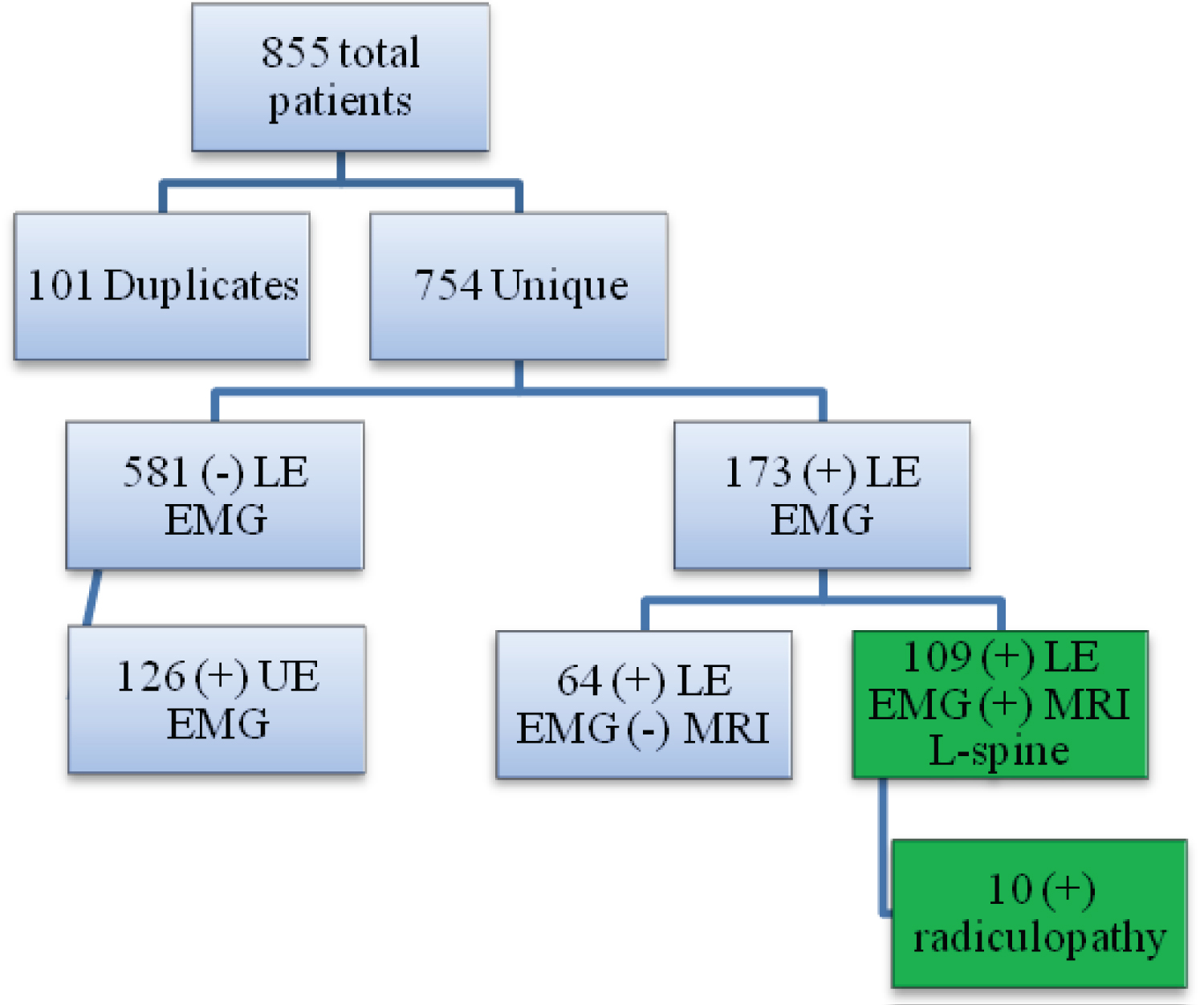 855 total patients were identified based on chart review. 101 of these patients were identified to be duplicate records and were removed from the study, leaving 754 unique patients that were further reviewed. Of the 754 patients, 581 patients did undergo LE EMG at the time of the study, 126 did undergo UE EMG. 173 patients did undergo LE EMG; however, 64 of the 173 patients did not have coinciding Lumbar MRI. This left 109 total subjects that had both MRI of the L-spine and LE EMG. 10 of these patients did have evidence of radiculopathy on EMG testing.