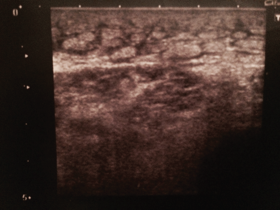 Figure 1: Marked thickening and soaking of subcutaneous adipose tissue in correspondence of the third distal of quadriceps muscle (about 8 cm from the patella, a maximum of 2.4 cm thickening, with signs of hyperechoic lobular organization, were observed).