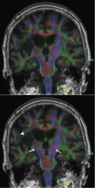 Figure 1: FA maps fused to coronal T1 sectioning rostrally the cerebral peduncles showing CSTs in blue (white arrows). Note the lesion (white arrowhead) on the affected side on the patient's right (left side of the image) and how it extends to the right CST. View Figure 1