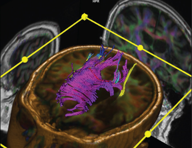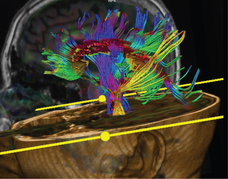 Figure 2: DTI fused to 3D T1 showing CSTs (yellow and blue) and CC (purple). View Figure 2
