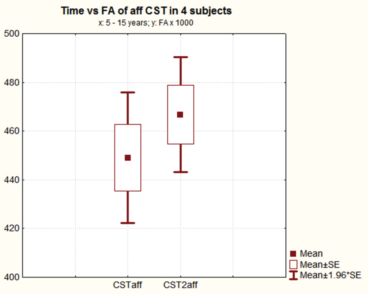 3 subjects with lesions occurred outside that range, i.e. less than 5 and more than 15 years, did not show statistically significant FA variations in the corticospinal tracts of the affected sides.