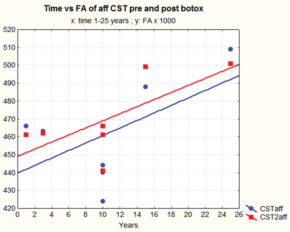 Figure 4: Time of evolution with range 1-25 years on x-axis vs. fractional anisotropy of the affected corticospinal tract before and after the injection of botulin in all 7 subjects. FA has been multiplied by 1000 to convert it into an integer. View Figure 4
