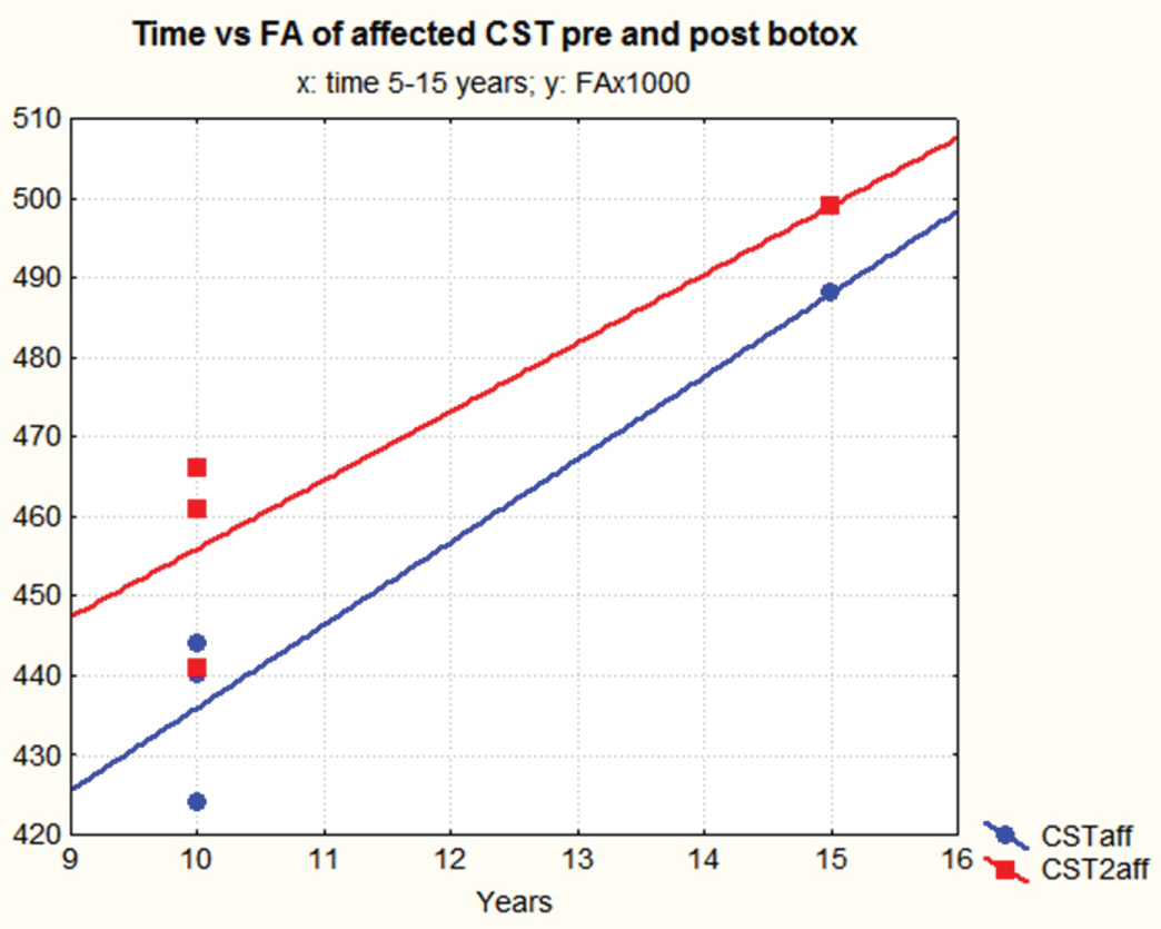 Additionally, 4 out of 7 subjects with lesions acquired 5 to 15 years prior to the development of spasticity showed statistically significant FA changes in the affected corticospinal tracts after the injections of botulin toxin.