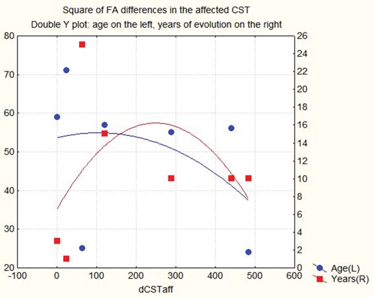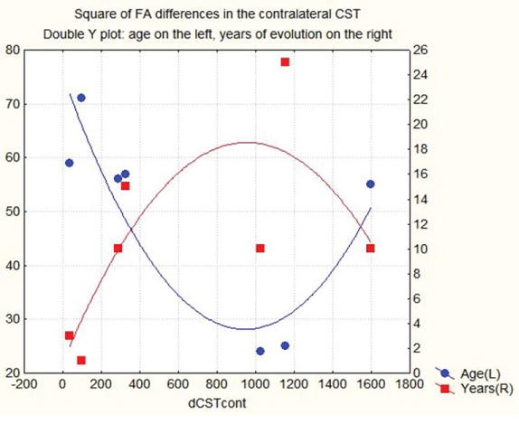 Figure 9: Double y-axis plot of square of the FA differences of the affected CST on x-axis, versus subjects age, on left y-axis, and years of evolution after CVA on right y-axis. (FA values are converted into an integer by multiplying them by 1000). View Figure 9