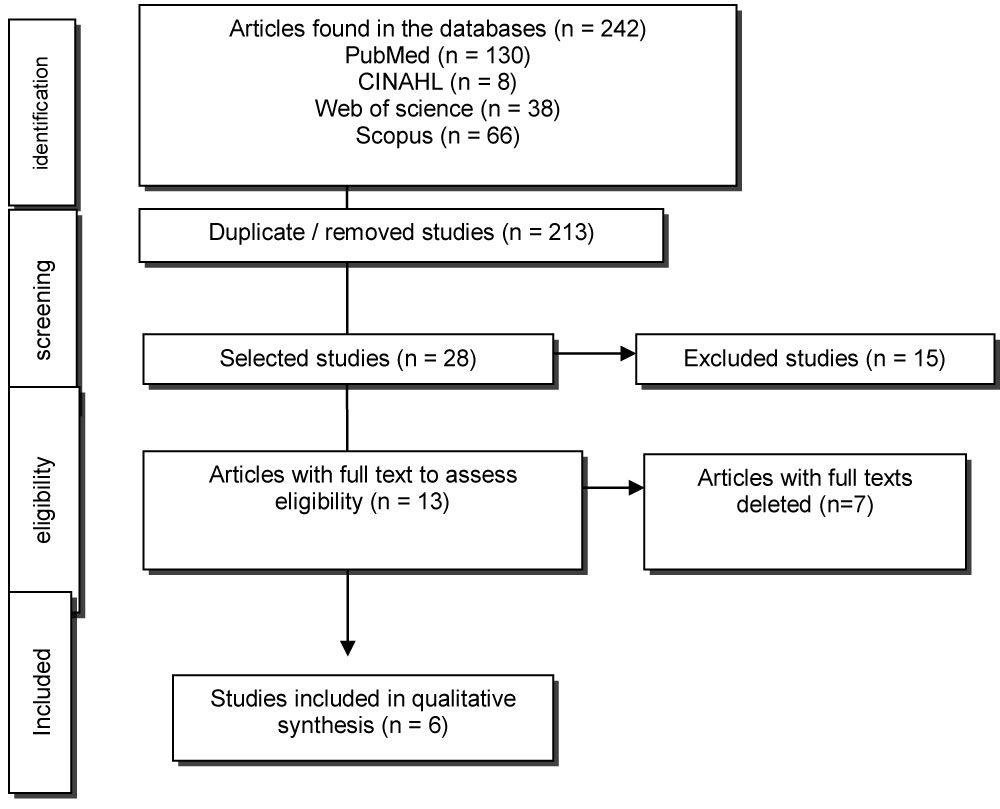In spite of being an integrative review, the authors opted for the criteria according to the model of the Preferred Reporting Items for Systemic Reviews and Meta-Analysis (PRISMA), using the flowchart that shows in detail the process of selection of the articles (Figure 1) [13].