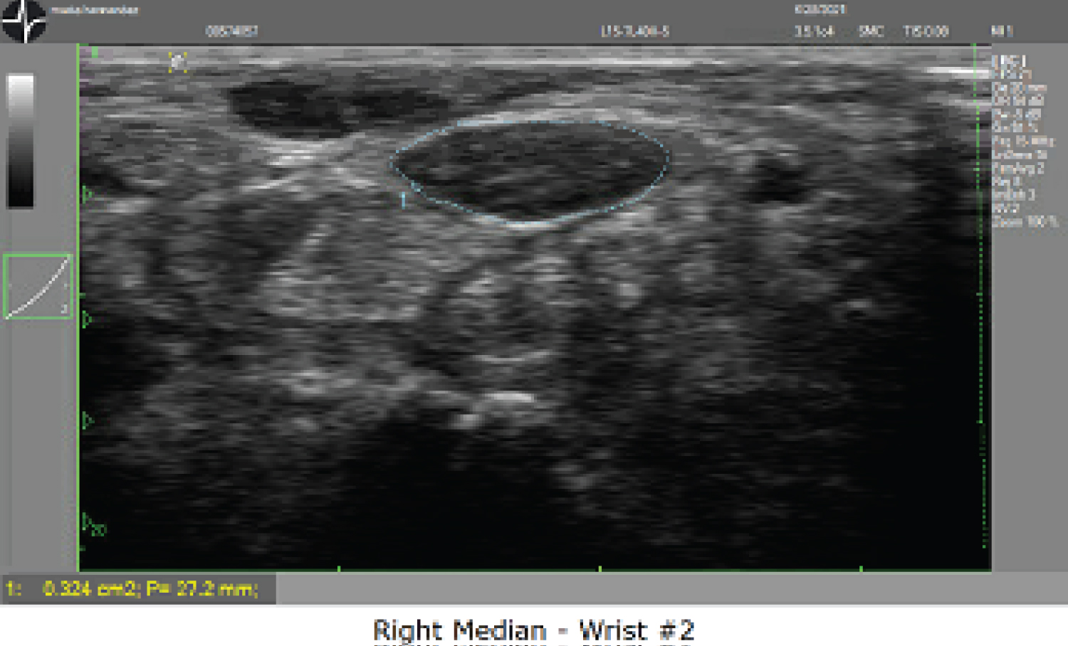 Our second patient is a 67-year-old female with chronic diffuse numbness and tingling in bilateral hands. Nightly wrist braces had provided only minimal symptomatic relief. Physical exam was significant for positive Tinel's and Durkan's test. EMG demonstrated severe bilateral median neuropathy with no sensory or motor response. A second lumbrical and interossei distal motor latency difference test (2L-INT DML) can be used to further characterize median mononeuropathy in patients with severe carpal tunnel syndrome to determine if there is any viable median nerve that may be amenable to surgery [25,26]. In this case, the test revealed very low amplitude and prolonged latency response of the median nerve. Ultrasound of the median nerves showed significant enlargement measuring 31.3 mm2 of the left median nerve cross sectional area and 32.4 mm2 of the right median nerve with no Doppler flow or masses within the median nerve appreciated (Figure 1B and Figure 1C). She underwent left and right carpal tunnel release surgery with significantly reduced numbness and tingling in both hands postoperatively (Table 2A, Table 2B, Figure 2 and Figure 3).