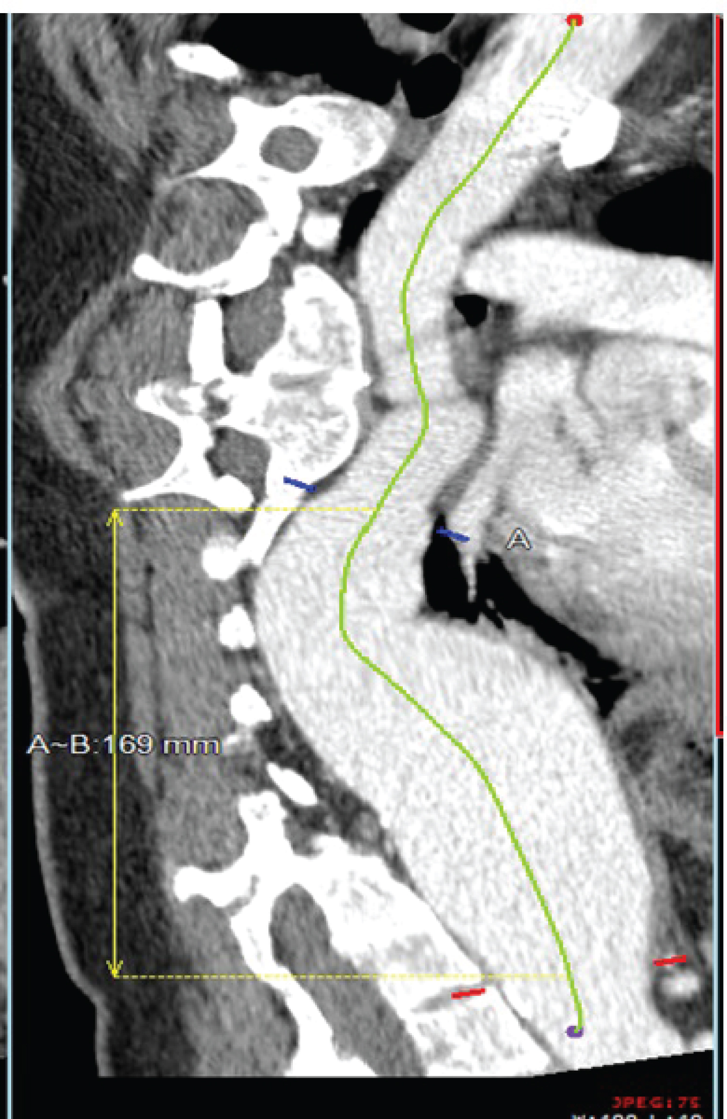 A 36-year-old woman with no significant past medical history presented to the emergency department with worsening suprapubic pain that had been present for 4-5 months and was found to have a urinary tract infection and symptomatic endometriosis. In the emergency department, computed tomography (CT) showed an incidental 7.3-cm descending thoracic aortic aneurysm. On presentation, the patient was hemodynamically stable with a heart rate of 116 bpm. She said that this could be normal during times of anxiety. On physical examination, she was noted to have normal pulses, well-perfused limbs, and to have moved all extremities appropriately, signaling no neurologic deficit at that time. She lacked any signs of marfanoid habitus. Laboratory results were notable only for hypokalemia, with a value of 2.9 mEq/L. She underwent a CTA confirming the diagnosis of a tortuous descending thoracic aortic aneurysm located at the distal thoracic component with aneurysmal dilation of 6.3 × 5.6 cm with no evidence of dissection or rupture (Figure 1). It is important to note the patient denied any family history of Marfan Syndrome and denied a family history of aneurysms. She also did not have any atherosclerotic risk factors, such as hypertension, hyperlipidemia, or diabetes mellitus, and was a lifetime nonsmoker. Upon genetic counseling, she was not found to have any known genetic associations with aortic aneurysms, including Marfan syndrome and Ehlers-Danlos syndrome.