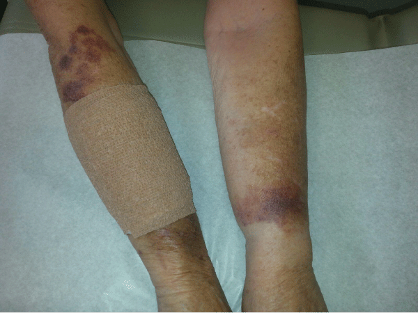 A 61-year-old white female presented to our primary care office with recurring purple lesions occurring on the arms, legs, and occasionally the trunk. The lesions usually occurred in these areas at different time periods. The discoloration lasted from several weeks to months and eventually resolved spontaneously.