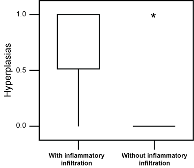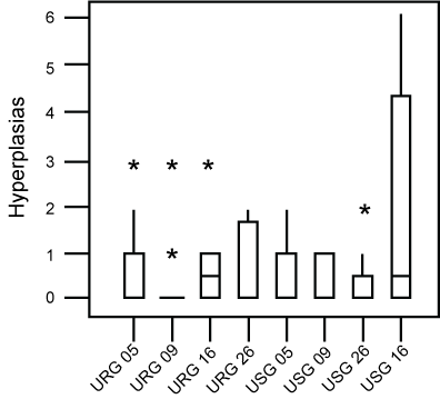 Figure 2: Box-plot of the distribution of hyperplasia found in each group. No difference was found between groups. Asteriks are outliers.