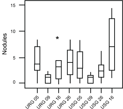 Figure 3: Box-plot of the distribution of nodules found in each group. No difference was found between groups.Asteriks are outliers.
