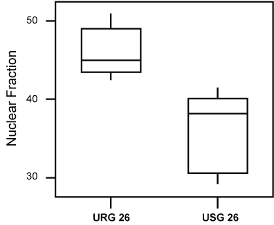 Figure 4: Box-plot of the Nuclear Fraction values of groups USG26 and URG26. The values of the nuclear fraction were higher (P = 0.008), in the group exposed to ROFA.