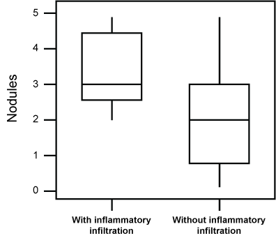 Figure 6: Box-plot of the incidence of pulmonary nodules in animals exposed to a daily dose of 120 μg ROFA for 16 weeks, presenting an inflammatory infiltrate, in comparison to the remaining ones. A higher value (P = 0.046) of nodules was seen in animals showing the infiltrate. View Figure 6