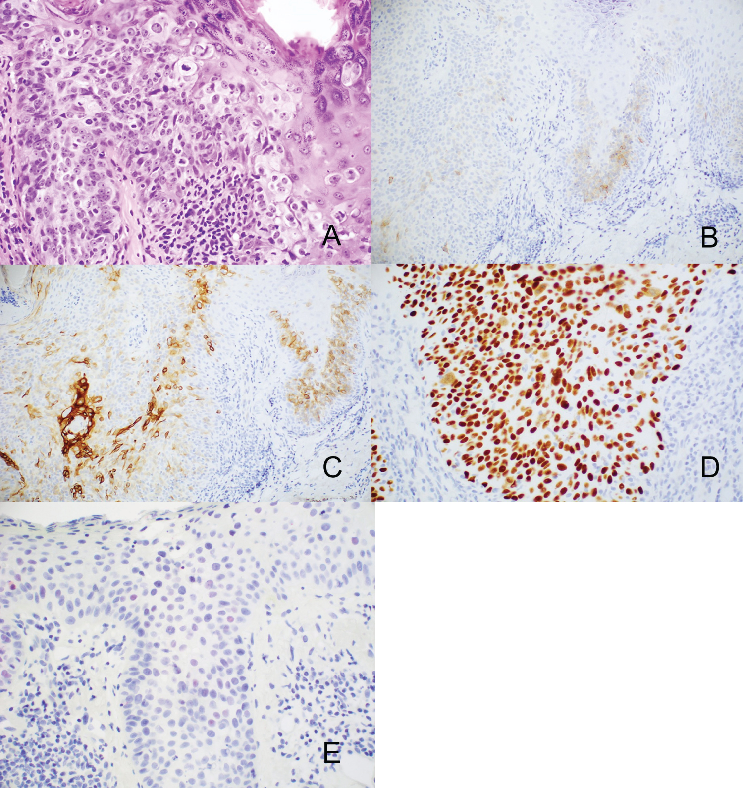 Figure 1: A) Pagetoid Squamous Cell Carcinoma in Situ seen with H&E staining (10x). B) Atypical cells are positive with p63 but negative with C) Ber-EP4 D) CK7 and E) Focal weak intensity PRAME expression is noted in this particular case.