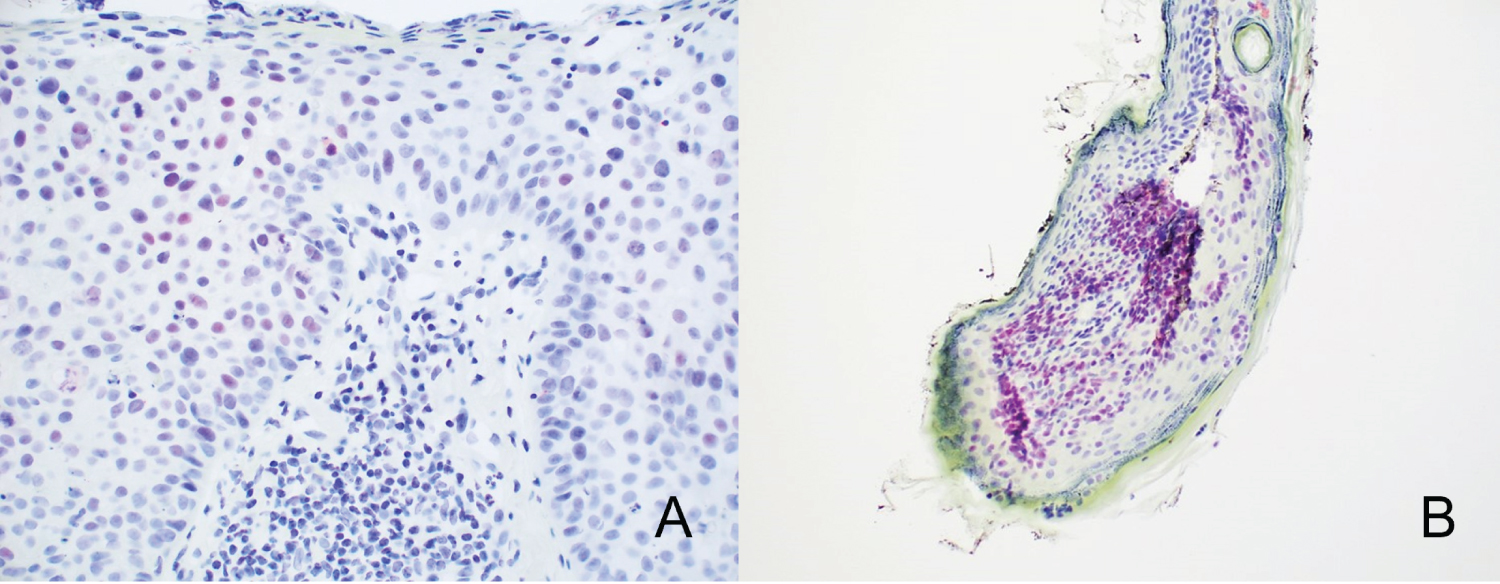 Definitive diagnosis of these lesions may involve investigation using immunohistochemistry. Markers such as Melan A/MART1 and SOX-10 predictably stain melanocytes [13] while Carcinoembryonic Antigen (CEA), Ber-EP4, and CK7, among others, can be utilized to highlight glandular cells in lesions of Paget's disease and extramammary Paget's disease [14,15]. Keratinocyte stains such as CK5/6 and p63 reliably mark the keratinocytes of squamous cell carcinoma in situ [16,17].