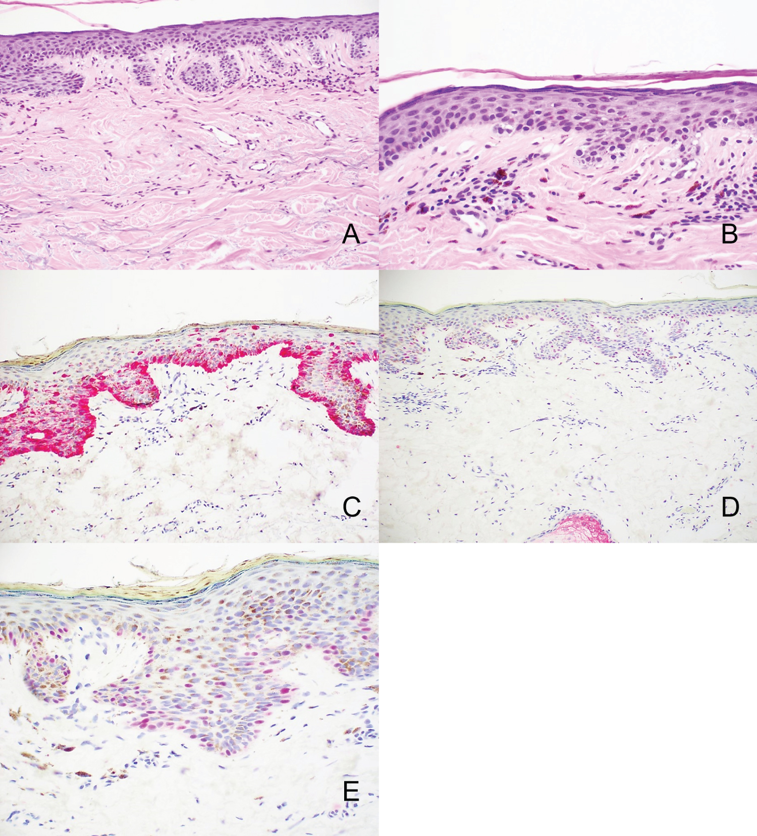 Figure 5: Melanoma in situ. A, B) Low and higher power views show a largely contiguous basal layer melanocyte proliferation with pagetoid spread. C) Melan A staining highlights all the melanocytes. D) Within this same lesion, there are areas of weaker intensity PRAME staining above a strongly staining internal positive control (sebaceous gland). E) Other areas of this lesion show more intense PRAME staining.