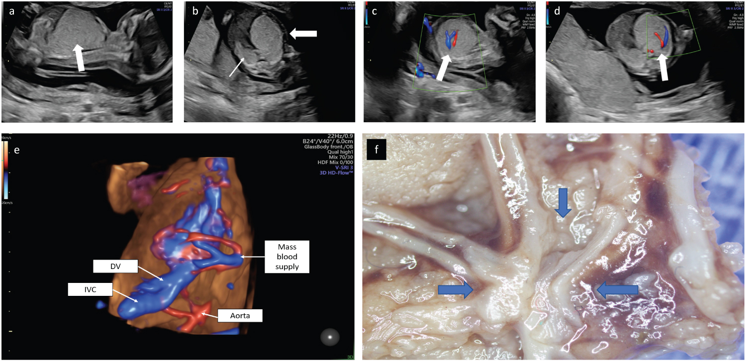 A 30-year-old patient, gravida 2 para 1 presented at 15 weeks of gestation. The parents were generally healthy with no remarkable family history. Nuchal translucency scan was normal. Sonographic examination revealed an appropriate for gestational age male fetus. Mild pericardial effusion and ascites were evident and an inverted A wave was demonstrated in the ductus venosus consistent with fetal cardiac insufficiency. The left apical heart was shifted to the right and the stomach was in a central position (mesogastria). The left lung was comprised of an echogenic mass with a measured circumference in an axial plane of 91 mm. No macro-cystic lesions were evident (Figure 1a, Figure 1b). Two large vessels exhibiting systemic venous and arterial flow were demonstrated entering the mass to form a vascular plexus (Figure 1c, Figure 1d, Figure 1e, Figure 1f). The diaphragm was flattened by the enlarged left lung. The right lung was compressed backwards and small (measured circumference in an axial plane 48 mm). A detailed anatomical scan did not reveal any further malformations. Following a comprehensive consultation regarding the findings, the parents elected termination of pregnancy.