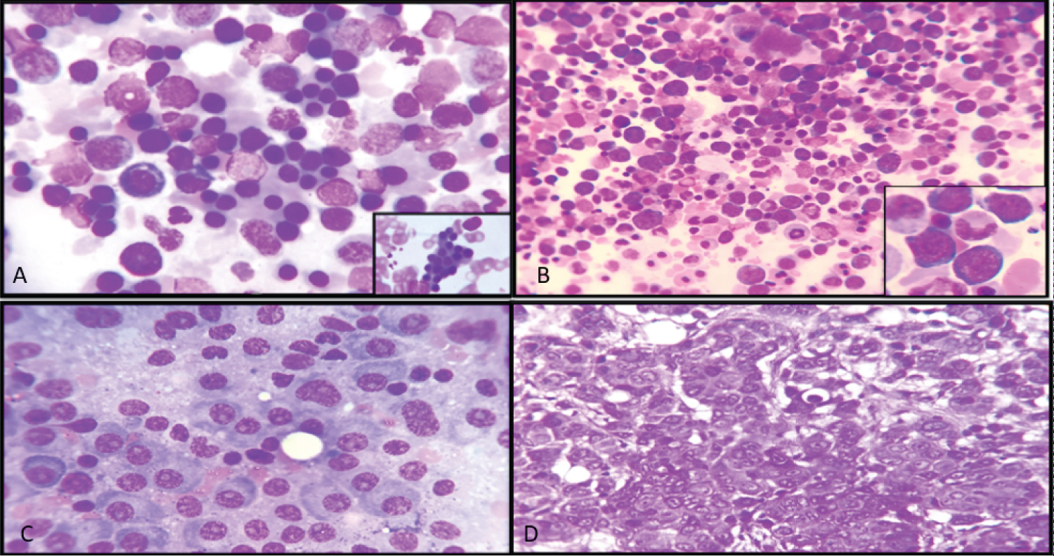 Figure 1: (A) Iron Deficiency Anaemia: Aspiration showing micro-normoblast maturation (100x), inset showing micro-normoblasts; (B) Megaloblastic Anaemia: Aspiration showing megaloblasts displaying sieve-like chromatin of the (40x), inset showing megaloblasts; (C) Multiple Myeloma: Aspiration showing sheets of plasma cells with few binucleated forms [arrow]. (100x); (D) Metastatic Deposits: Biopsy showing pleomorphic tumour cells (H&E 40x).