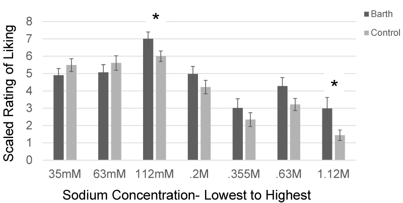 Group differences in hedonic liking of sodium infused chicken broth samples was examined using a MANCOVA analysis. Results, after controlling for age, were found to be non-significant (F(7,56) = 1.69, p = 0.131, Wilk's Λ = 1.865, partial ɳ2 = 0.174), indicating no differences in how the two groups rated their liking of the samples. However, examination of between subjects effects noted significant group differences for the 112 mM sample (p < 0.05) and the 1.12 M sample (p < 0.05); as well as a value approaching significance for the 0.63 M sample (p = 0.085). As noted in (Figure 2), the BTHS group had higher rating scores, indicating greater liking, for each of these samples. Age had no statistically significant effect on the multivariate model.