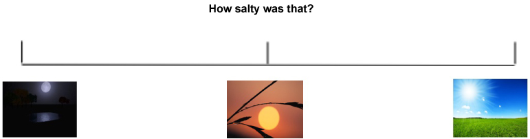 Before testing, subjects were asked to rinse their mouths out with warm water for 10-15 seconds. Samples were provided to each subject in the following order: 112 mM, 0.63 M, 35 mM, 0.2 M, 63 mM, 1.12 M, and 0.355 M. After each presentation, subjects rated the degree of liking/disliking for each broth by pointing along a visual scale (Image 2a). Similarly, they were asked to rate how salty they thought each broth was; this saltiness rating scale (Image 2b) utilized pictures and analogies to help subjects understand and communicate their perceptions of the saltiness of the broth samples. The subjects were asked to think of the scale of perceived saltiness with no salt being like a dark night with no sun and extremely salty being like a bright sunny day [13]. After rating each broth sample, subjects proceeded to rinse their mouth with water for approximately 10-15 seconds. The centimeter side of a standard 12 -inch ruler was then used to convert the ratings to numerical values (range 0-10). Higher numbers represented a higher degree of liking by the subjects and a higher perceived saltiness.