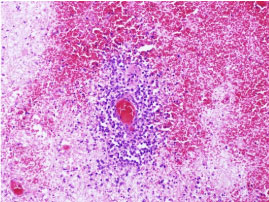 Figure 3: Histopathological features of one of the areas of vasculitis evidenced in the central nervous system (hematoxylin-eosin). There is a small vessel vasculitis with an inflammatory infiltrate invading and destroying the wall. The infiltrate is mainly made of lymphocytes. Prominent accompanying phenomena of hemorrhage and necrosis are also found.