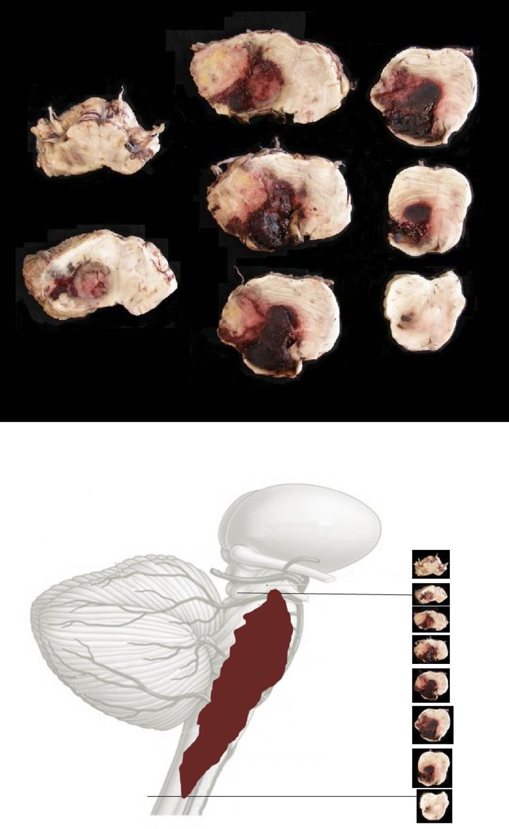 Figure 4: Macroscopic brainstem samples showing hemorrhage and their anatomic location.