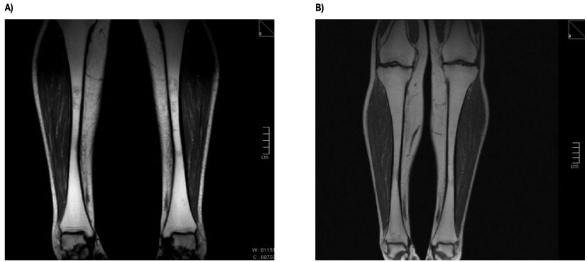 Figure 2: Coronal T1 - weighted images MR images of tibia of a female Gaucher patient. A) Tibia before switch from imiglucerase to eliglustat. The images obtained detected an abnormal focal changes marrow bone - focal low signal intensity in both diaphysis, sparing the epiphysis and metaphysic; B) After 6y of eliglustat therapy, images of the same patient noted there was increased bone marrow signal in the diaphysis, compared with the baseline, with no lesions detected in diaphysis.