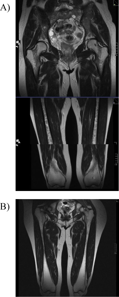 A) Femur before switch from imiglucerase to eliglustat. Images clearly show diffuse homogeneous hypointensity in diaphysis. BMB score 7 for the femur. B) After 6y of eliglustat therapy. Images After 6y of eliglustat therapy, images indicate BMB score of 4 for the femur. Proximal epiphysis slightly hypointense on T2, indicating a marrow response following medication with eliglustat. Initial Düsseldorf score of 8B improved to 3B after 6 years of treatment (increased bone marrow signal in the tibias [not shown in the present illustration] while both metadiaphysis of the femur are still affected).