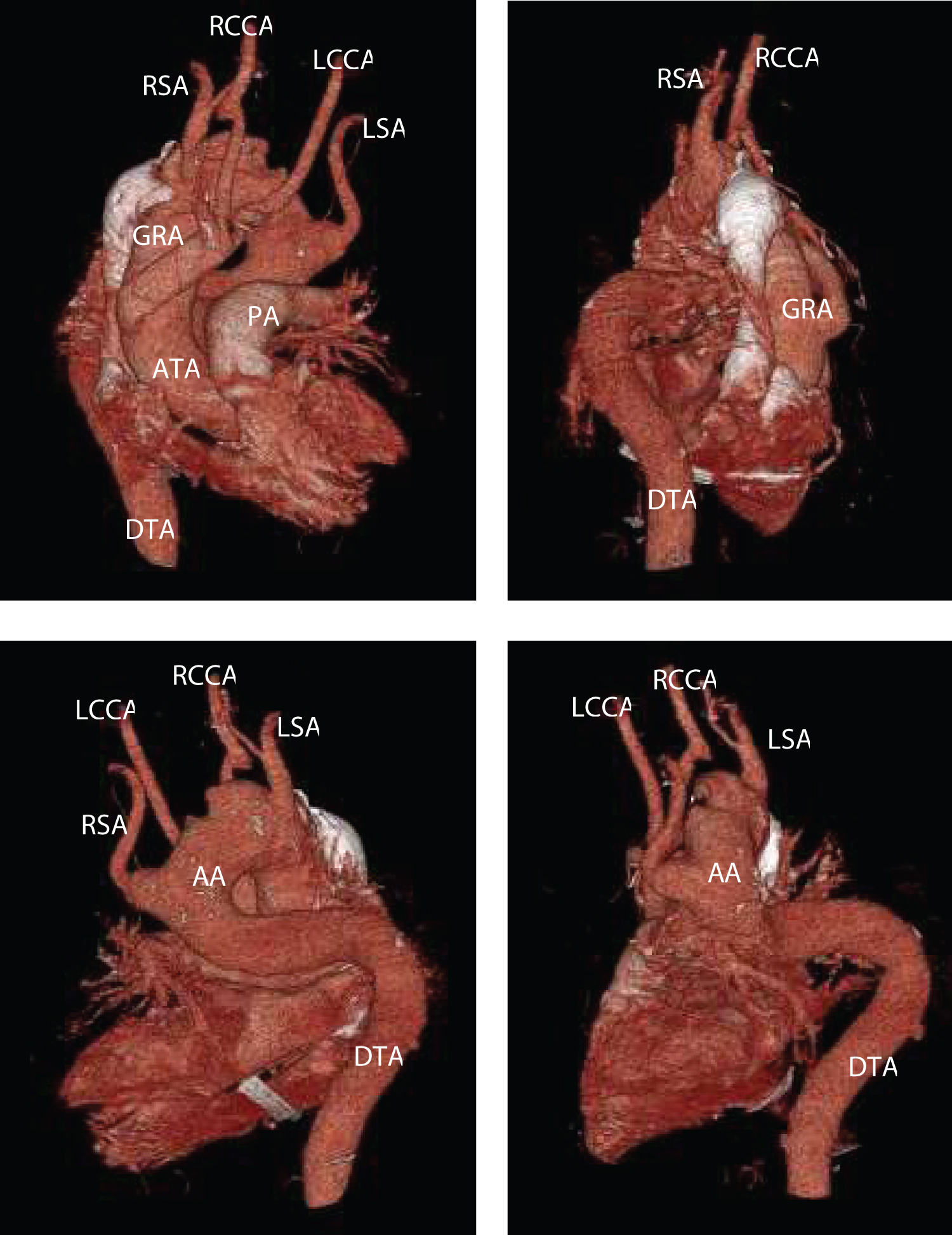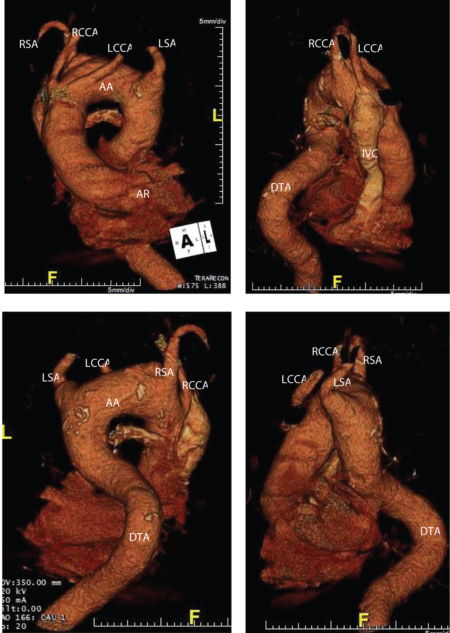 Aside from CT angiogram, a conventional CT aortogram was done in our patient to better visualize the aberrant vessels along with its blood flow along its critical supra-aortic branches. Detailed evaluation of the aortic arch anatomy is important for planning thoracic surgery and endovascular intervention since the presence and pattern of arch variants and anomalies may influence the surgical incision, cardiopulmonary bypass cannulation and interventional approach. In addition, decisions regarding whether to repair coexisting lesions in the same procedure should be considered [15,16].