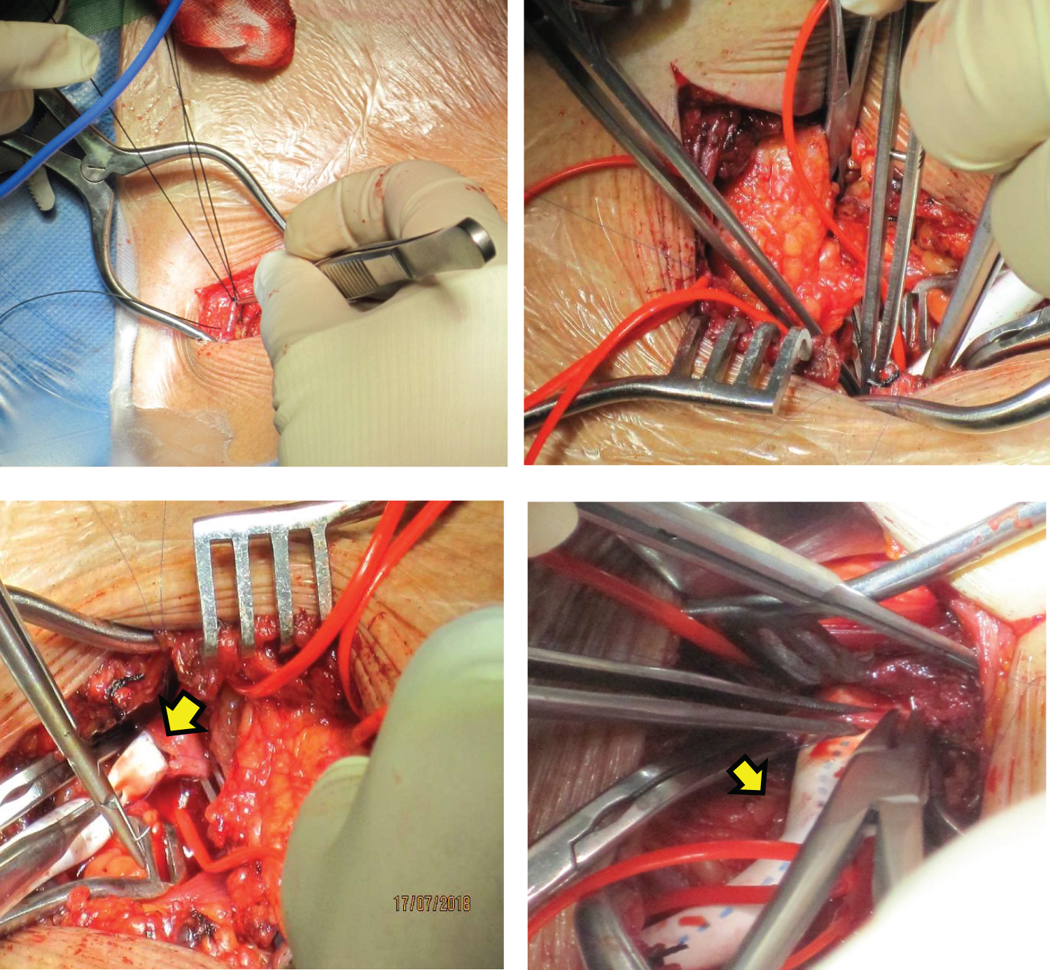 Figure 7: Intraoperative pictures of aortic arch debranching using a Polytetrafluoroethylene graft (arrowhead) for the anastomosis.