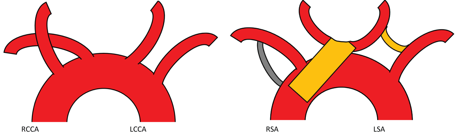 Routine work up for surgery in our patient revealed a congenital aortic anomaly. Normally, the aortic arch is almost always left sided and gives rise to the three great vessels; first the brachiocephalic trunk (BCT), then the left common carotid artery, and finally the left subclavian artery. The BCT branches into right subclavian artery and right common carotid artery. This branching pattern occurs in 64.9-94.3% of cases and is described as “normal” [7].
