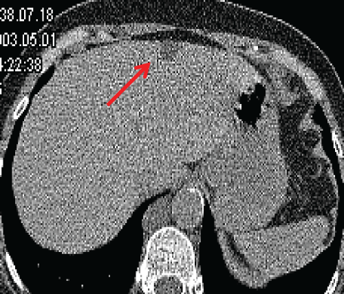 Figure 2: 63-year old man with adrenal adenoma. Axial LDCT image shows a 3 cm low density (-7 HU) right adrenal nodule (arrow)