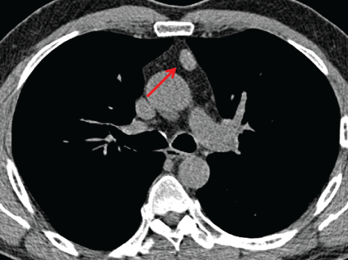 Figure 3: 67-year old man with a nodule in anterior mediastinum (arrow). Axial LDCT image shows a 1-cm soft tissue nodule in anterior mediastinum which was stable over 3 annual screening CT scans