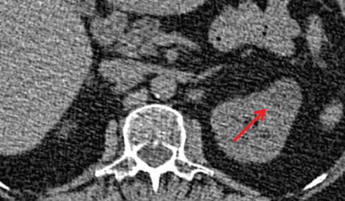 Figure 5: 73-year old man with left renal cell carcinoma. Axial LDCT image shows a 3.5 cm hypodense mass in the upper pole of left kidney (arrow).