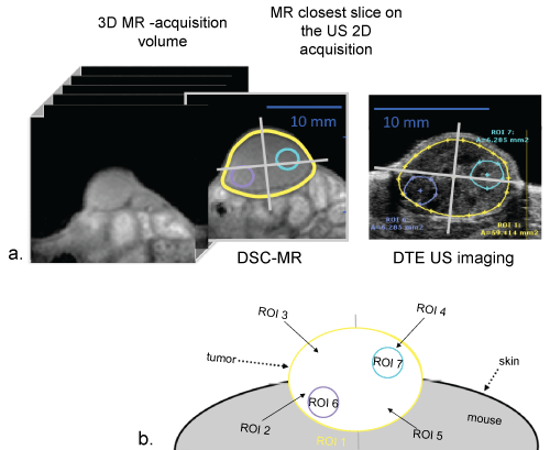 Figure 2: Schematic of data segmentation and ROI delimitation a) MR data colocalization on the US 2D acquisitions (B-mode) to choose the closest slice in the 3D MR-acquisition volume (R2*-weighted images, first echo); b) Bi-dimensional Regions of Interest (ROIs) were defined manually to delimit the whole tumor (ROI 1), ¼ of the tumor section (ROI 2 to 5), hyper- (ROI 6) and hypo- (ROI 7) vascularized areas. The last two ROIs systematically measured 3.14 mm2 (circle with a radius of 1 mm). View Figure 2