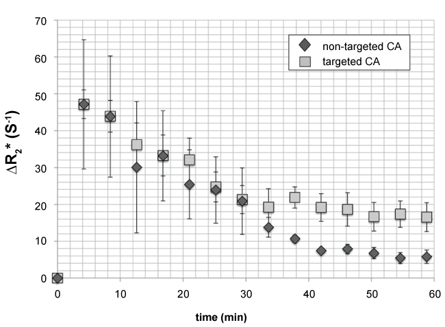 Figure 4: ΔR2* mean values (± Standard Error SE), for targeted (square) and non-targeted (diamond) CA as a function of time. ΔR2* values became significantly different between targeted and non-targeted CA for all acquisitions performed every 7 minutes between 37 and 60 minutes postinjection (p = 0.03, Wilcox on test for paired samples), thus providing the most appropriate imaging window to image specific binding. At 1 hour postinjection, ΔR2* measurement for targeted CA was 16.5 ± 3.9 s-1, significantly different from the values recorded for non-targeted CA, namely 5.8 ± 1.8 s-1 (p = 0.03, Wilcox on test for paired samples). View Figure 4