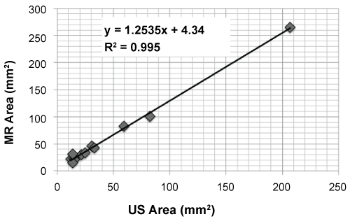 Figure 6: Tumoral size evaluation from MR and US imaging, where r = 0.99, p < 0.001 (Pearson test). The tumor area measured from MR imaging was 25% higher than that estimated using US. View Figure 6
