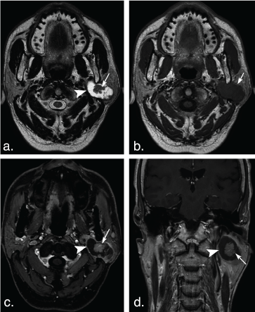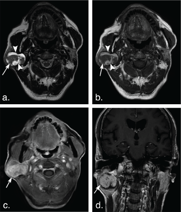 Figure 1: A 75-year-old man with basal cell adenoma in both superficial and deep lobes in the right parotid gland. Axial T2 weighted image (a) and axial T1 weighted image (b) show a well-defined, encapsulated, heterogeneous, lobulated tumor with irregular cystic area (arrowheads) and solid nodule (arrows). The solid portion of the tumor shows hypoinentse signal on T2 weighted and T1 weighted images and marked enhancement (arrow) compared with the surrounding parotid gland on axial contrast-enhanced fat-suppressed T1 weighted image (c) but mild enhancement (arrow) on coronal non-fat suppressed T1 weighted image (d) (arrows). View Figure 1
