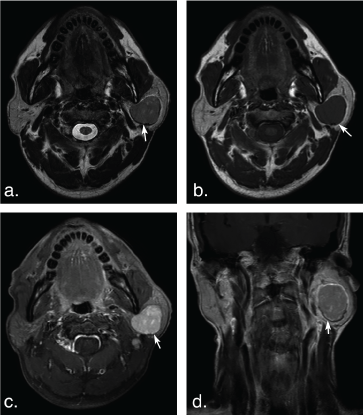 Figure 2: A 53-year-old man with basal cell adenoma in the deep lobe of the left parotid gland. Axial T2 weighted image (a) and T1 weighted image (b) shows a well-defined, ovoid solid-looking tumor (arrows). The tumor shows slight hypointense signal on T2 weighted image and T1 weighted image, marked enhancement (arrow) on axial contrast-enhanced fat-suppressed T1 weighted image (c) but mild enhancement (arrow) on coronal non-fat suppressed T1 weighted image (d). View Figure 2