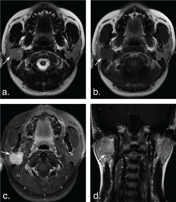 Figure 3: A 14-year-old woman with pleomorphic adenoma in the deep lobe of the right parotid gland. T2 weighted image (a) and T1 weighted image (b) show a well-defined, lobulated tumor (arrows). The tumor shows hyperintense signal on T2 weighted image and hypointense signal on T1 weighted image, marked enhancement (arrow) on axial contrast-enhanced fat-suppressed T1 weighted image (c) but mild enhancement (arrow) on coronal non-fat suppressed T1 weighted image (d). View Figure 3