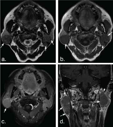 Figure 6: A 74-year-old man with multiple Warthin tumors in the superficial lobe of the right parotid gland and the deep lobe of the left parotid gland. Axial T2 weighted image (a) and axial T1 weighted image (b) show multiple, well-defined, ovoid tumors in bilateral parotid (arrows). The tumors show hypointense signal on T2 weighted and T1 weighted MR images, and mild enhancement (arrow) on axial contrast-enhanced fat-suppressed T1 weighted image (c) and coronal non-fat suppressed T1 weighted image (d) (arrows). View Figure 6