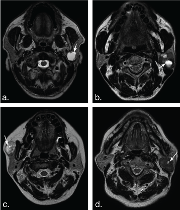 Figure 7: Different shape of the cystic areas in the parotid gland tumors. (a) T2 weighted image shows a large ovoid cystic hyperintense cystic area (arrow) in a basal cell adenoma of a 57-year-old man. (b) T2 weighted image shows several ovoid cystic hyperintense cystic areas (arrows) in Warthin tumors of a 52-year-old man. (c) T2 weighted image shows a small round cystic hyperintense cystic area (arrow) in the heterogeneous pleomorphic adenoma of a 39-year-old female with on. (d) T2 weighted image shows a small ovoid cystic hyperintense cystic area (arrow) in a Warthin tumor of an 84-year-old man. View Figure 7