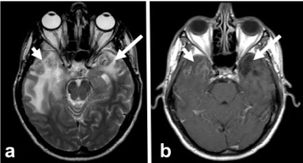 Figure 2: First year control MRI. Axial T2A image (a) in the left temporal lobe edema decreases, gliosis is observed to develop (arrow). In addition, another T2 hyperintense lesion with a similar character is present in the right temporal lobe (short arrow). Post-contrast axial T1W image (b) shows no contrast enhancement in the left temporal lobe (arrow) and heterogeneous enhancement in the right temporal lobe (short arrow). View Figure 2