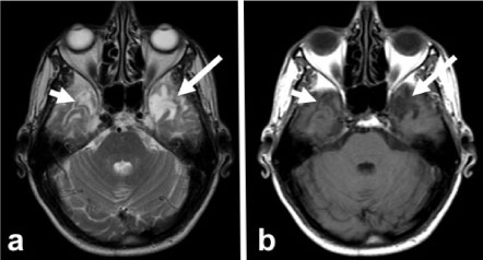 Figure 3: 18 months control MRI. Axial T2A (a) and T1A (b) images show the disappearance of edema and mass in both temporal lobes and encephalomalacia and gliosis (arrows). View Figure 3