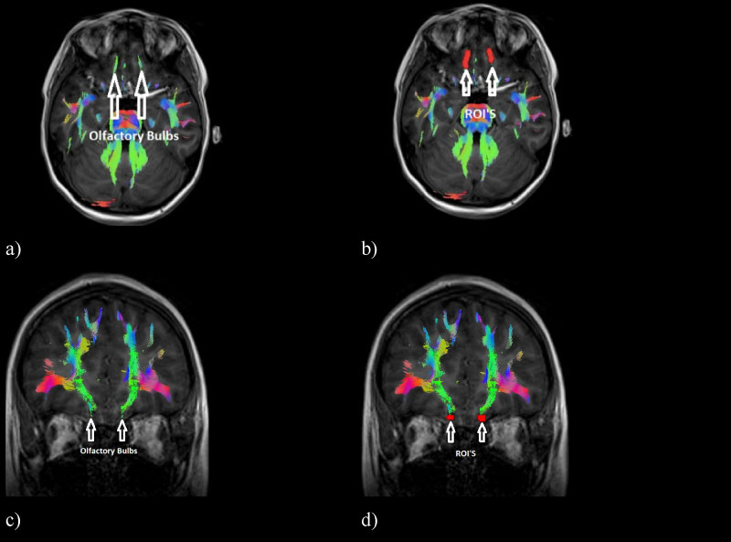 Figure 1: ROIs on the olfactory bulbs where information about odours. a) Axial view of the tracts corresponding to the olfactory bulbs, b) Axial view of the ROIs placed on the olfactory bulb, c) Coronal view of the tracts corresponding to the olfactory bulbs and d) Coronal view of the ROIs on the olfactory bulb.