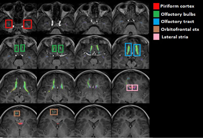 Figure 4: Axial view of the olfactory tracts (inferior to superior) emphasizing the piriformis cortex, the olfactory bulbs, the olfactory tract of the olfactory bulbs, the orbitofrontal cortex and the lateral stria.