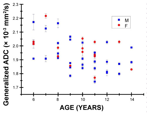 Generalized FA and ADC values can be seen to change with age. According to existing understanding about the development of the brain, the degree of myelination varies according to age, although previous studies suggest that the myelination process develops mostly in the first 5 years [24]. The neurological maturation process may also depend on the diameter of the axons and thickness of the insulated myelin sheath [25]. It is therefore useful to evaluate the normal development of children's brains. The results obtained have some similarity to those obtained by previous studies on different areas of the brain [26].