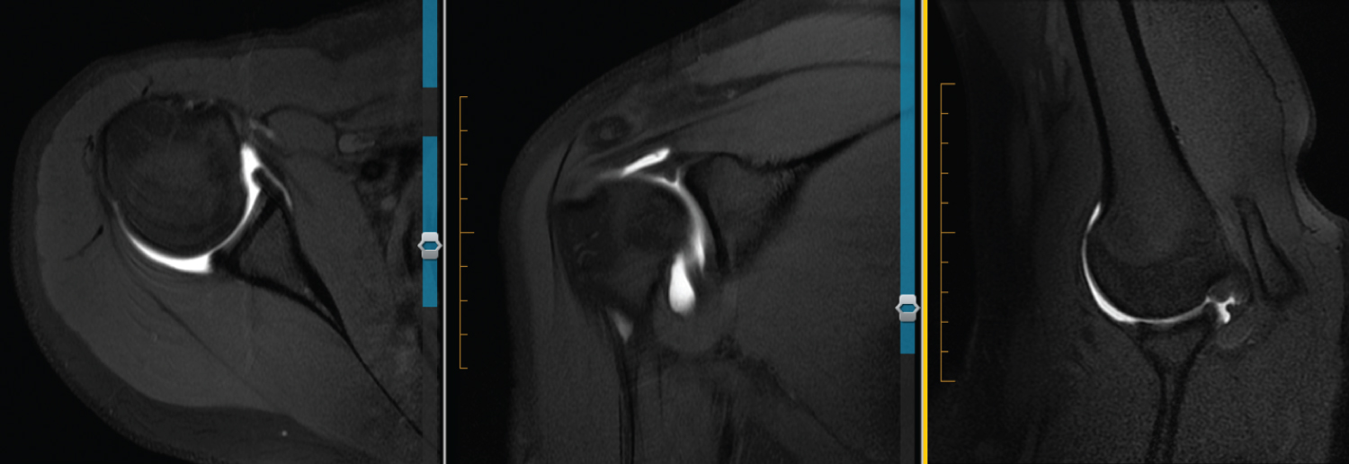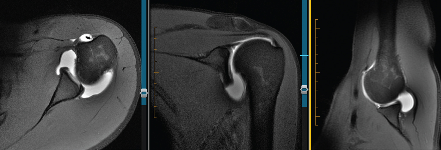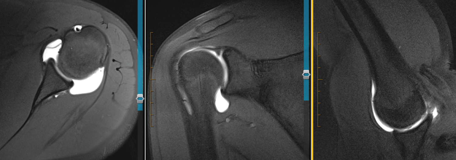 Figure 1: 16 F R MRA. From left to right: Axial T1 FS, Coronal T1 FS, and T1 FS ABER. Labrum looks blunted, rounded and undefined on axial. Nearly absent on coronal. Intact IGHL on ABER and intact labrum.
