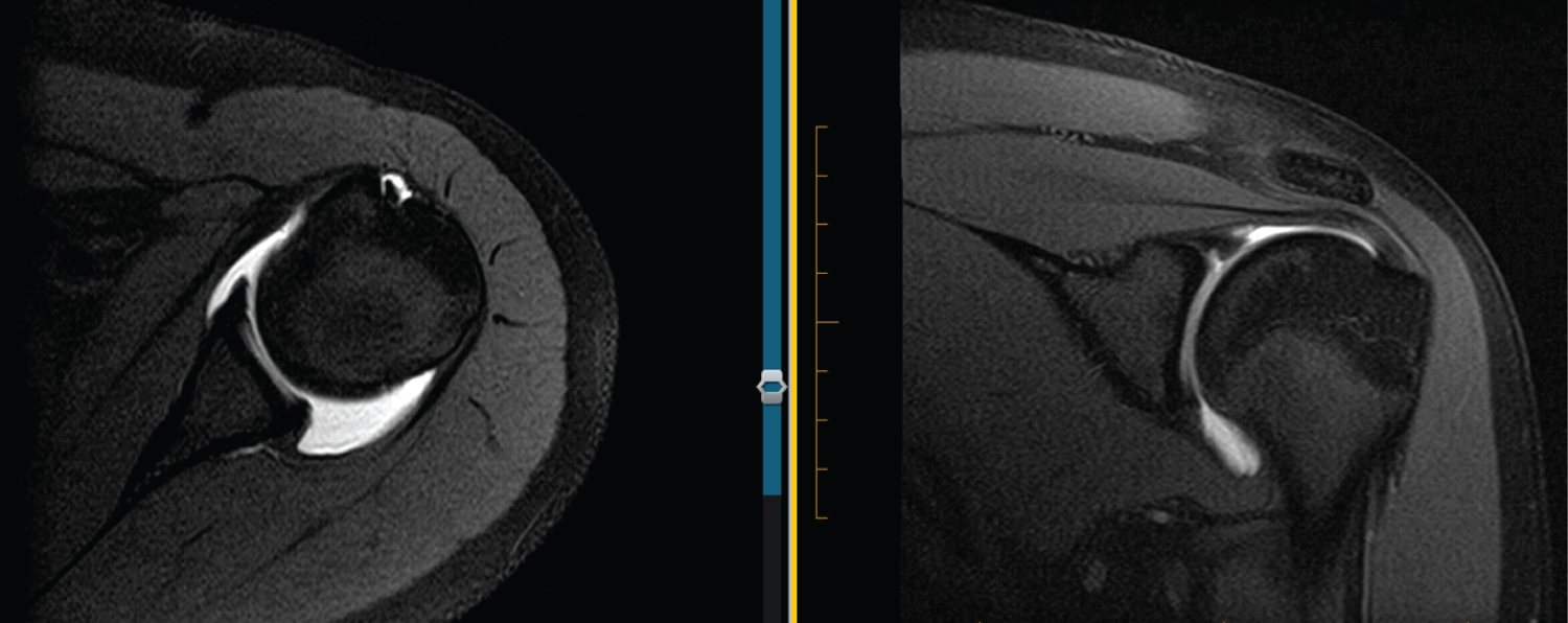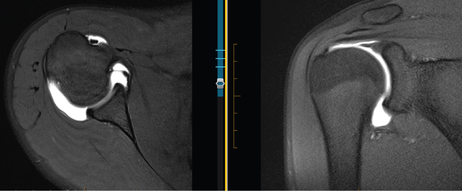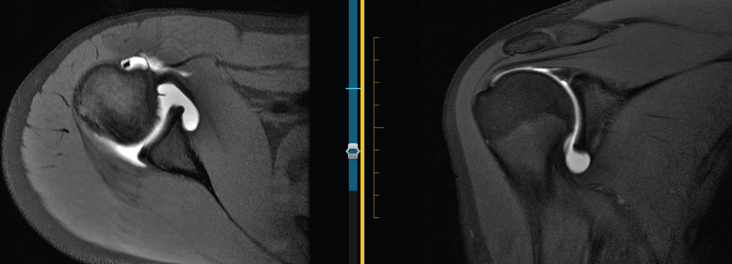 Over the last month, the images were re-evaluated. The surgeon and a fellowship trained musculoskeletal (MSK) radiologist were asked to independently interpret the images, specifically focusing on the anterior inferior labrum (from 3 to 6 o'clock). Coronal and axial images were used to visualize the anterior inferior labrum. The goal was to find a pattern or pathognomonic lesion at the anterior inferior labrum consistent in swimmers.