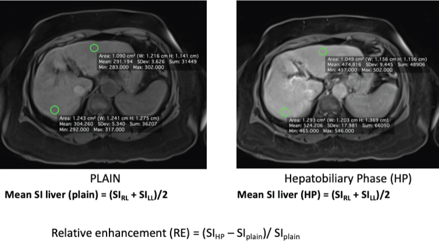 Figure 1: ROI were being drawn on both liver lobes on plain MRI (A) and hepatobiliary phase (B) and calculation of the relative enhancement (RE) based on the formula as depicted.